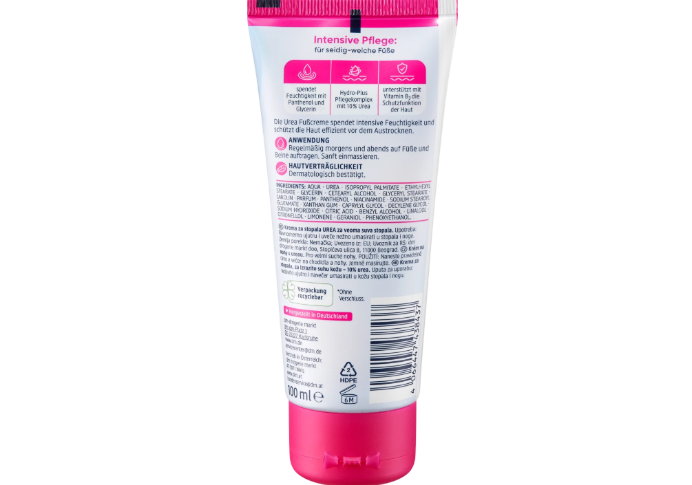 Réduit le dessèchement et la tension: la crème pour les pieds Balea Urea procure une hydratation intense et protège efficacement votre peau du dessèchement. La formulation avec le complexe de blanchiment HydroPlus, composé à 10% d'urée hydratante, de panthénol et de glycérine hydratante, procure à vos pieds une douceur remarquable. La texture crémeuse est facile à étaler et à absorber rapidement. De plus, la formule de soin à la vitamine B3 soutient la fonction protectrice naturelle de la peau.