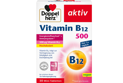 Les comprimés de vitamine B 12 de Doppelherz peuvent être pris pour contribuer à un métabolisme énergétique normal. La vitamine B 12 peut aider à réduire la fatigue et l’épuisement. Idéal pour des besoins accrus ou une alimentation déséquilibrée.